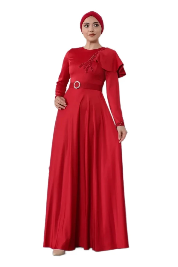 Bel Detaylı Tesettür Abiye Elbise 660-Kırmızı