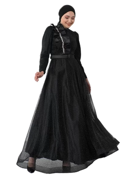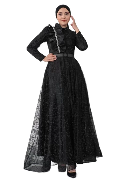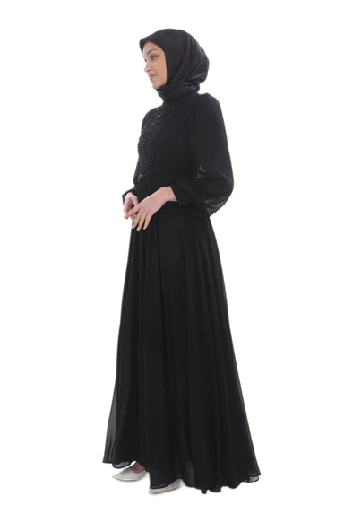 Nakış Detaylı Tesettür Abiye Elbise 688-Siyah