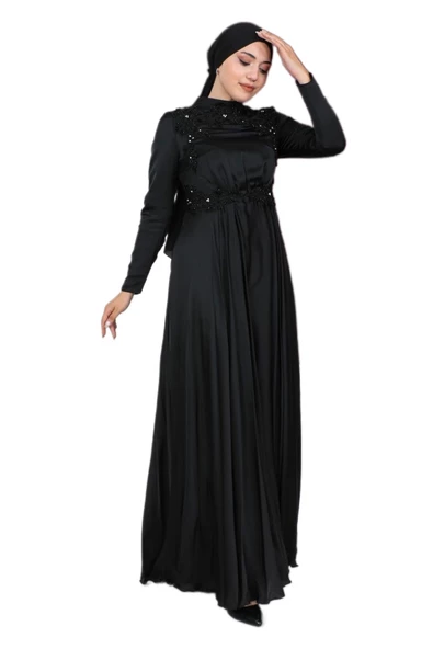 Boncuk İşlemeli Saten Tesettür Abiye Elbise 706-Siyah