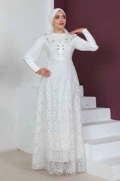 Taş Ve İnci Deteylı Güpür Tesettür Elbise 721-Beyaz