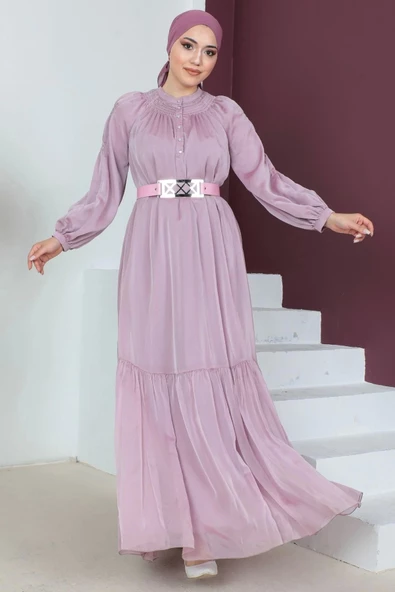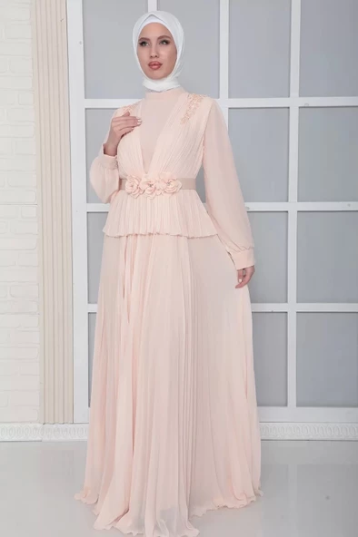 Omuz Ve Kemer Detaylı Pliseli Tesettür Abiye Elbise 816-Pudra