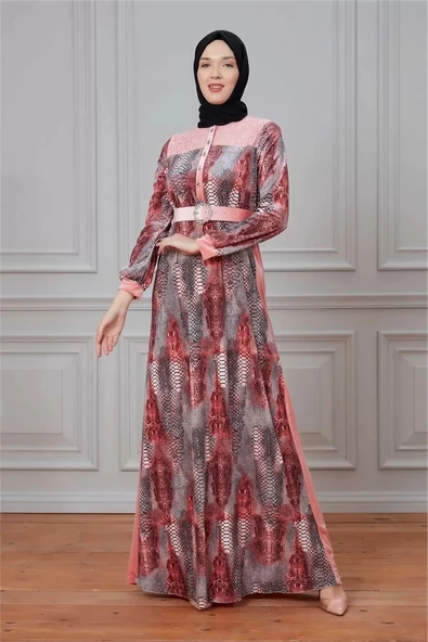 Leila Piton Desenli Kadife Elbise 699-Pudra