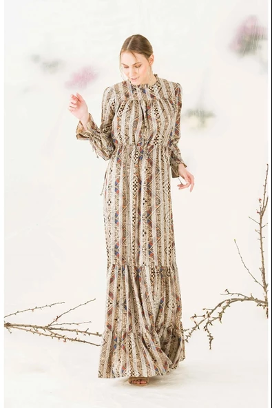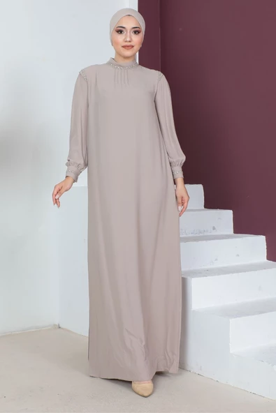 Boncuk Detaylı Ferace Elbise 692-Bej