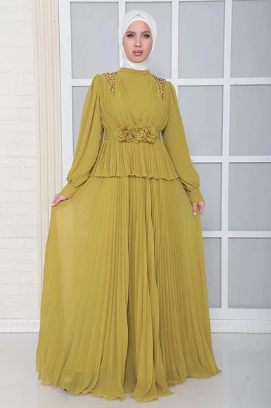 Omuz Ve Kemer Detaylı Pliseli Tesettür Abiye Elbise 816-Yağ Yeşili