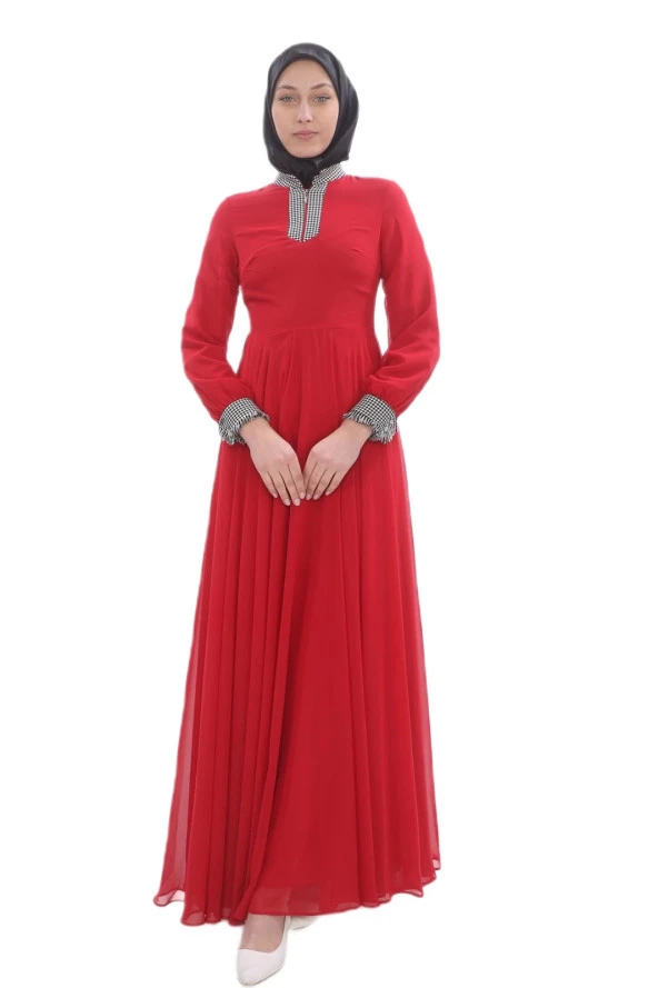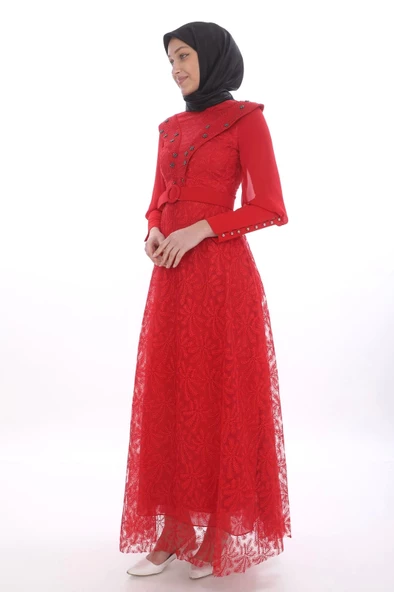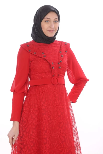 Taş Ve İnci Deteylı Güpür Tesettür Elbise 721-Kırmızı