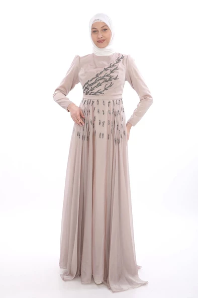 Taş İşleme Detaylı Tesettür Abiye Elbise 741-Bej