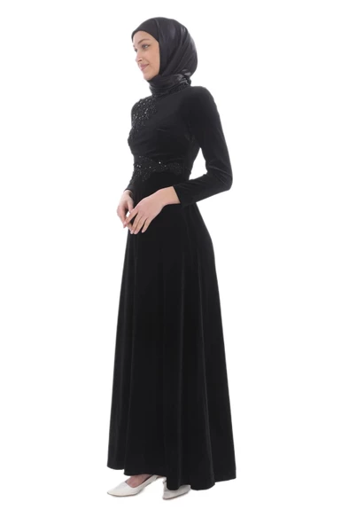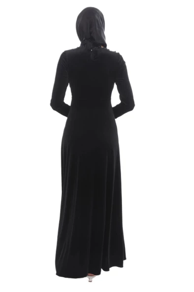 Aplike Detaylı Kadife Tesettür Abiye Elbise 694-Siyah