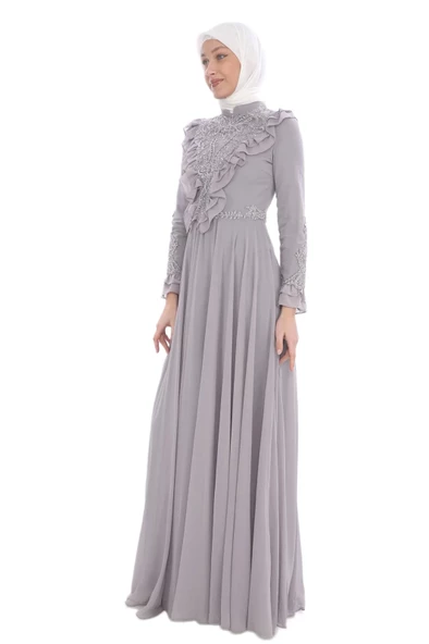 Fırfır Aplik İşlemeli Tesettür Abiye Elbise 724-Gri