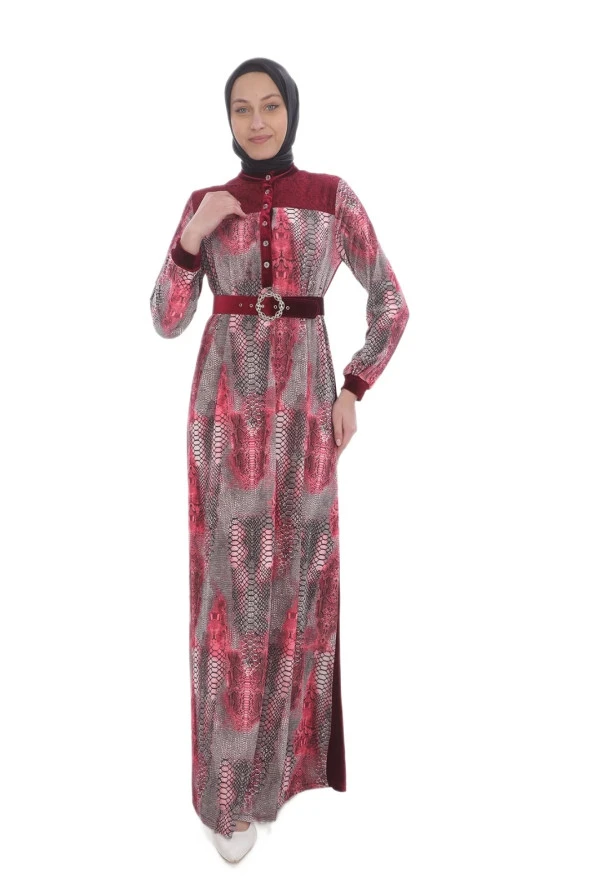 Leila Piton Desenli Kadife Elbise 699-Bordo
