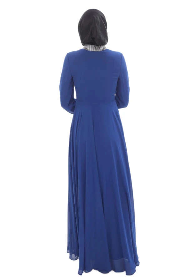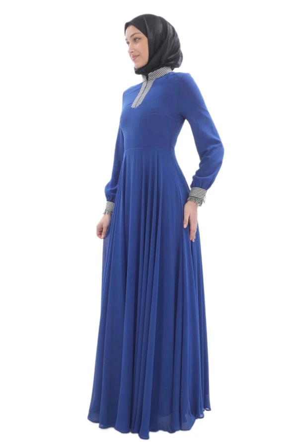 Yaka İşlemeli Kol Fırfırlı Taşlı Çiçek Detaylı Elbise 2708-İndigo