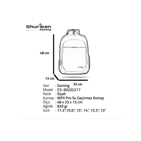 Shuriken ES-BAGGU17 17" Gaming ,Seyahat Laptop Sırt Çantası