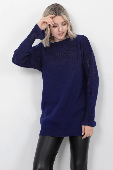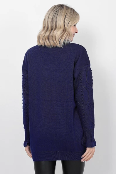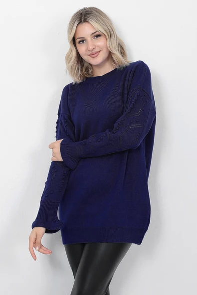 Kadın Triko Kazak Bisiklet Yaka Kolu Desenli Oversize Lacivert