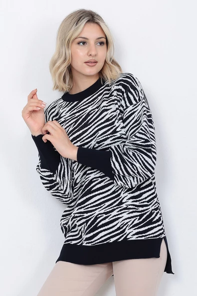 Kadın Triko Kazak Bisiklet Yaka Zebra Desenli Oversize Yırtmaçlı Beyaz Siyah
