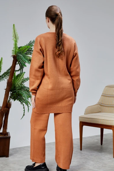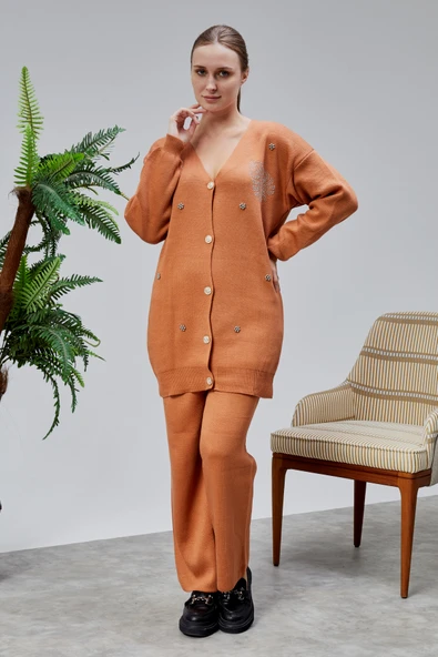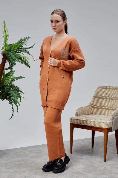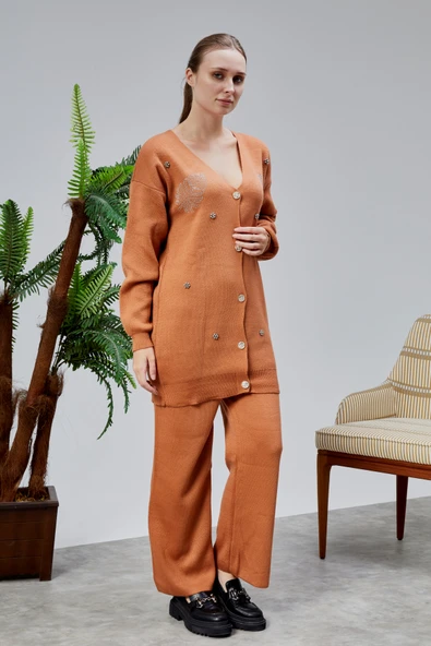 Kadın Triko Takım Taşlı Standart Beden Tarçın