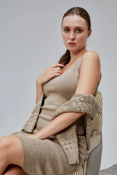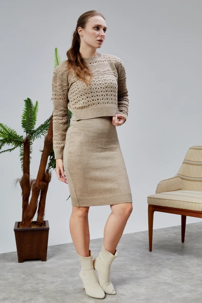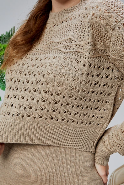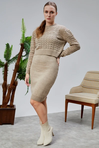 Kadın Triko Takım Delikli Kazak ve Askılı Elbise Standart Beden Vizon