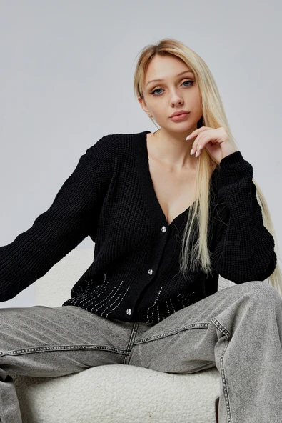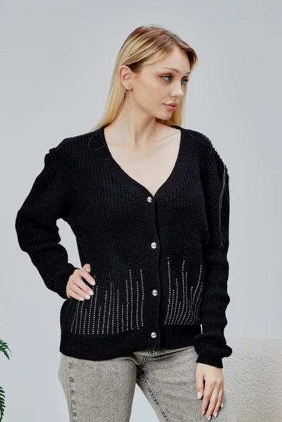 Lugmo Kadın Triko Hırka Taşlı Standart Beden Siyah