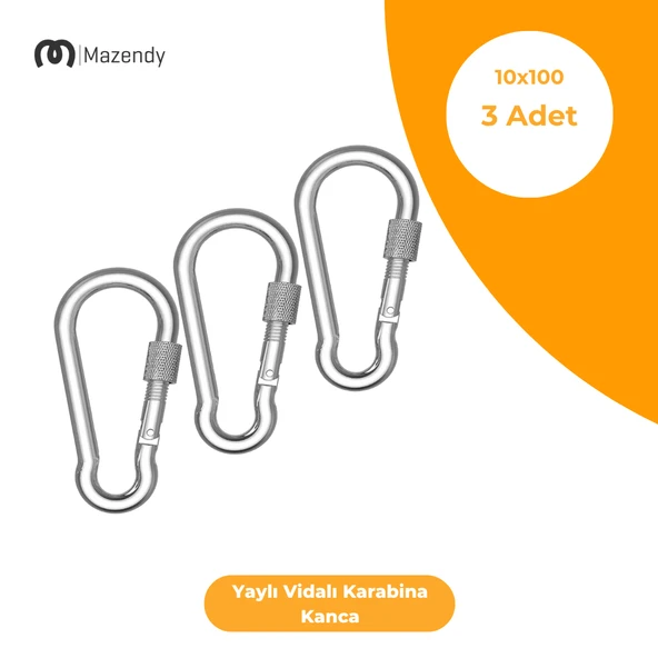 Vidalı Yaylı Karabina Kanca - 10x100 mm (3 Adet) - Kamp, Güvenlik, Emniyet, Anahtarlık