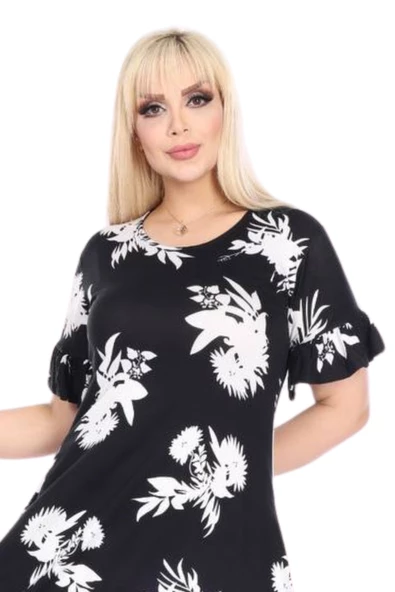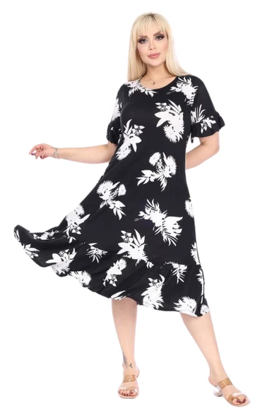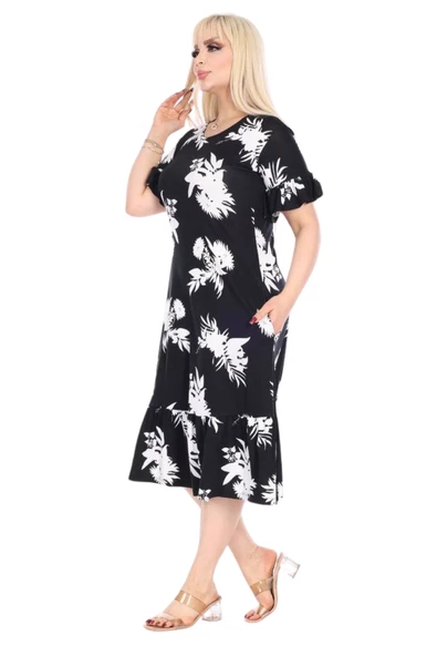 Melsay Butik Fırfırlı Kısa Kollu Siyah Beyaz Yaprak Desenli Cepli Elbise