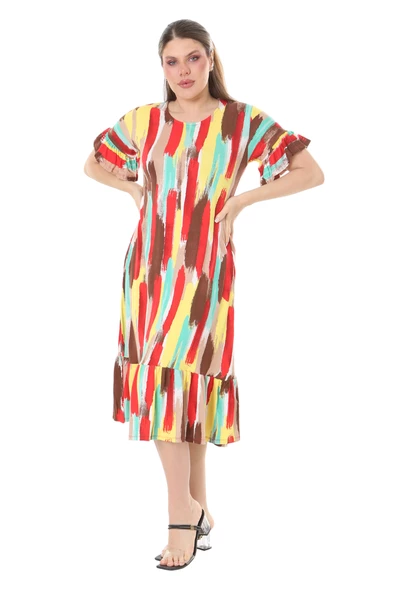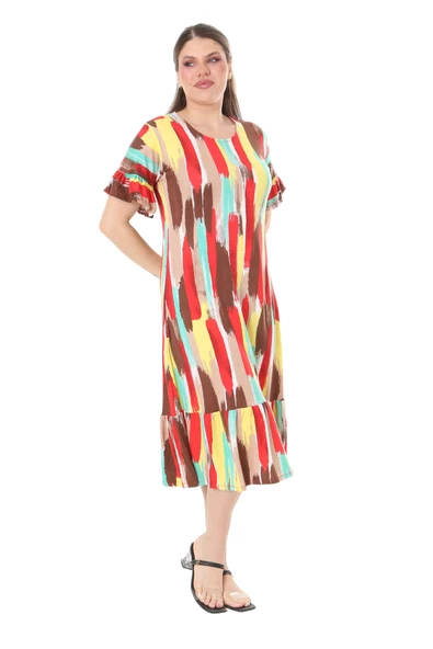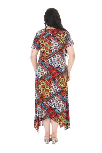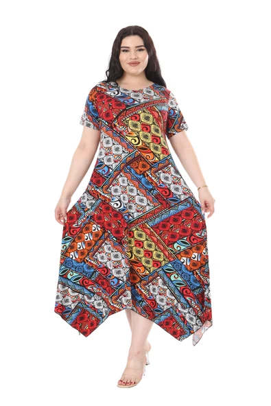 Melsay Butik Sax Balık Desen Kısa Kollu Büyük Beden Midi Elbise