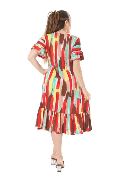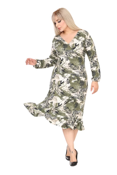 Melsay Butik Yumoş Kumaş Kruvaze Yaka Yeşil Batik Desen Eteği Fırfırlı Midi Elbise