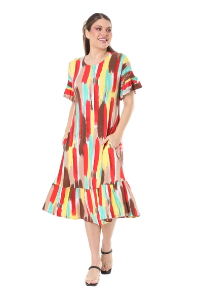 Melsay Butik Kısa Kollu Fırfırlı Cepli Turkuaz Mercan Desenli Midi Elbise