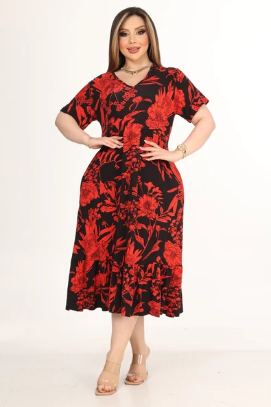 Melsay Butik Göğüsten Robalı V Yaka Kısa Kollu Kırmızı Palmiye Desenli Cepli Elbise