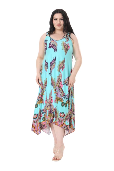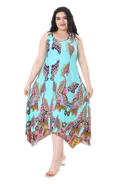 Melsay Butik Turkuaz Renkli Şal Desenli Askılı V Yaka Elbise