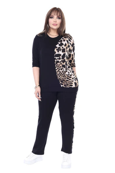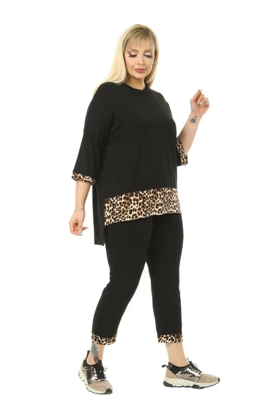 Melsay Butik Siyah Puanlı Eteği Leopar Desen Asimetrik Kısa Kollu Elbise