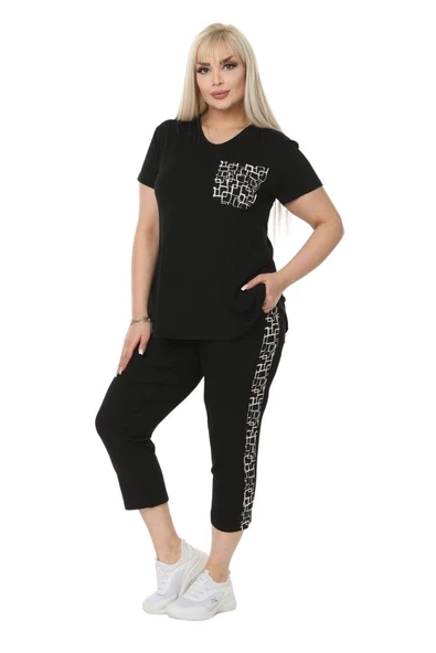 Melsay Butik Siyah Yakası Şeritli V Yaka Sweat Büyük Beden Elbise