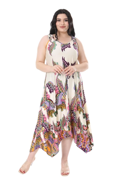 Melsay Butik Ekru Renkli Şal Desenli Askılı V Yaka Elbise