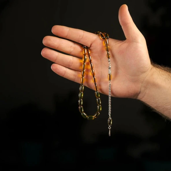 Renk Almış Sıkma Kehribar 925 Ayar Gümüş Püsküllü Tesbih