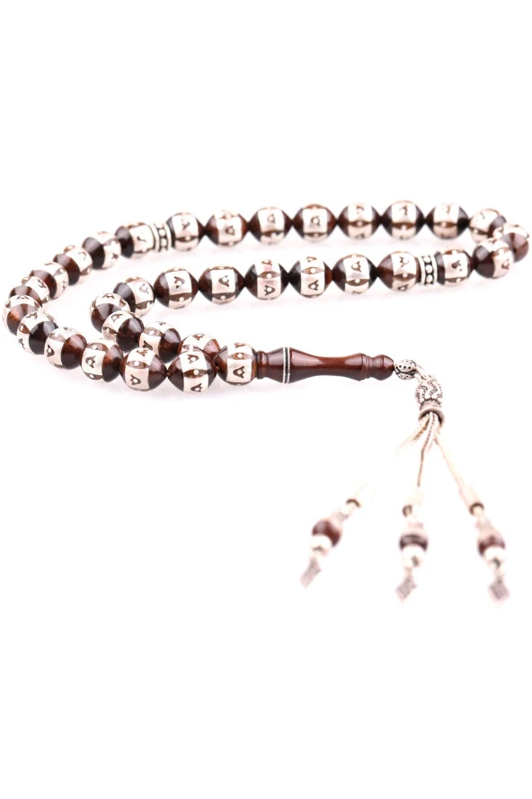 25 Ayar Gümüş Çakımlı İmame Nakkaş Gümüş İşlemeli Ateş Kehribar Tesbih