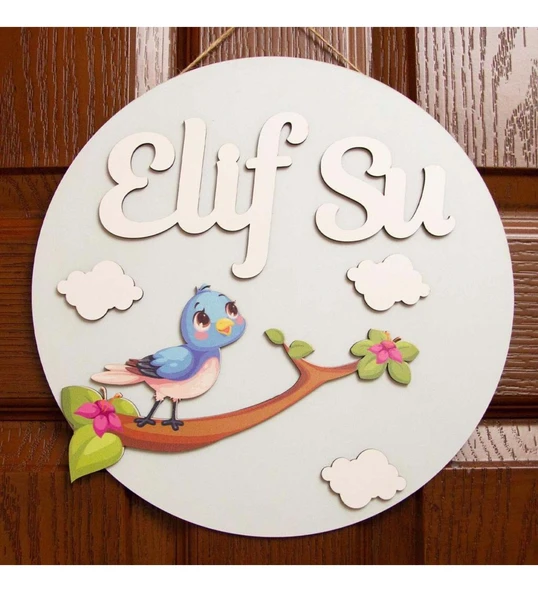 İsme Özel Küçük Kuş Tasarımlı Çocuk Odası Kapı Süsü