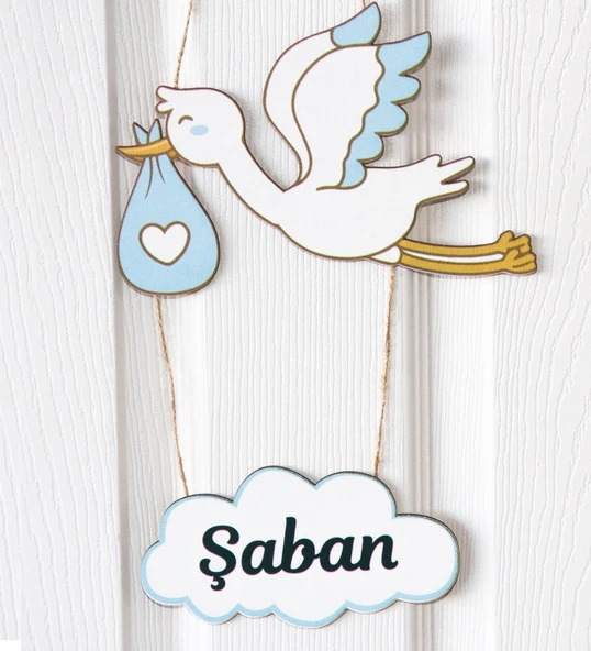 Meşgalem Mavi Uçan Leylek ve Bulut Temalı Kişiye Özel Kapı Süsü