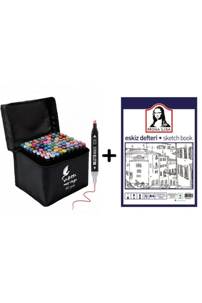 Minopi 80'li Çift Taraflı Art Marker Keçeli Kalem Seti Çantalı + Mona Lisa Eskiz Defteri 50 Yaprak 120GR.