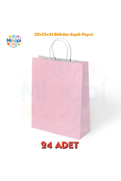Minopi 24 Adet Büküm Saplı Pembe Çanta 25x12x31 cm Kağıt Çanta