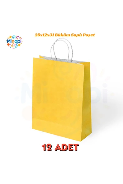 Minopi 12 Adet Büküm Saplı Sarı Çanta 25x12x31 cm Kağıt Çanta