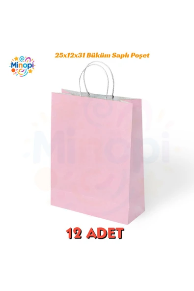 Minopi 12 Adet Büküm Saplı Pembe Çanta 25x12x31 cm Kağıt Çanta