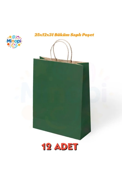 Minopi 12 Adet Büküm Saplı Yeşil Çanta 25x12x31 cm Kağıt Çanta