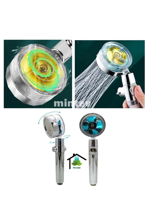 Şeffaf Turbo Pervaneli Duş Başlığı 360 Derece Döner Su Tasarruflu