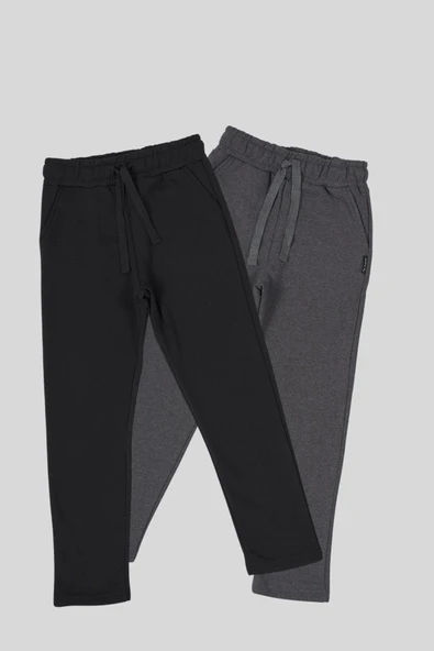 Siyah-Antrasit Kalın Pamuklu Beli Lastikli Yan Cepli 2'li Erkek Çocuk Eşofman Altı