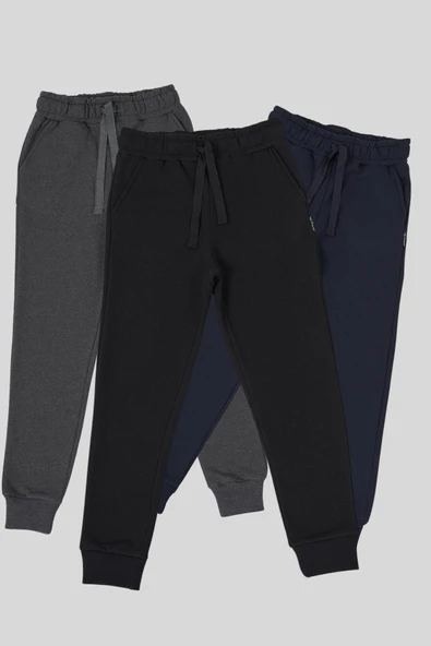 Siyah-Lacivert-Antrasit Kalın Pamuklu Beli Lastikli Yan Cepli 3'lü Erkek Çocuk Eşofman Altı