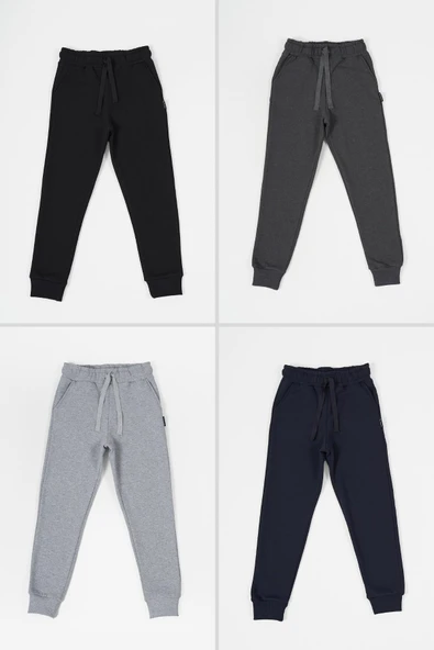 Siyah-Lacivert-Antrasit-Gri Kalın Pamuklu Beli ve Paçası Lastikli Cepli 4'lü Erkek Çocuk Eşofman Altı