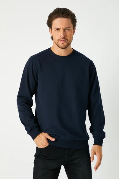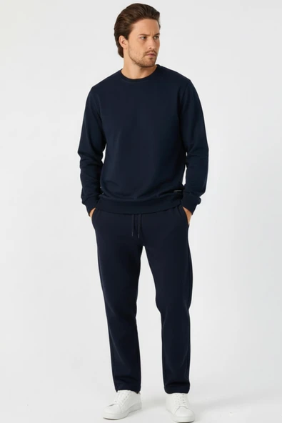 Lacivert Relaxed Fit Bisiklet Yaka Sweatshirt Düz Paça Erkek Eşofman Takımı