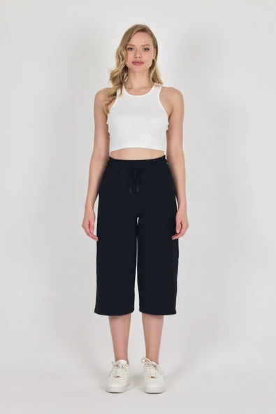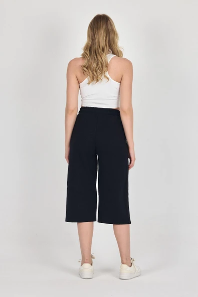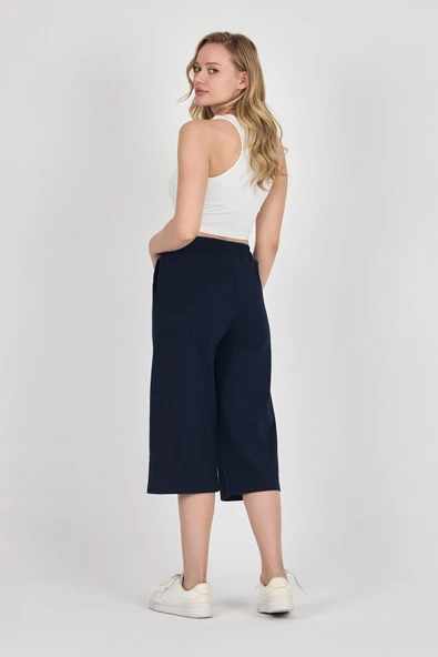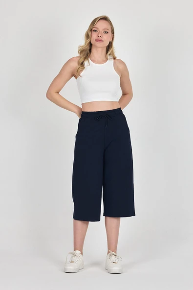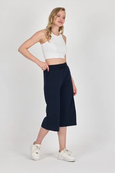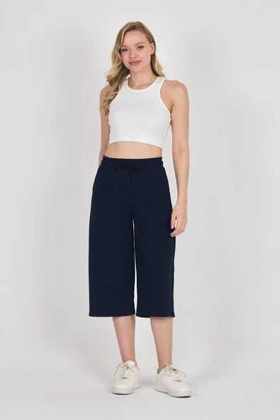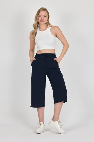 Yüksek Bel Cepli Rahat Kesim Mevsimlik Kadın Diz Altı Bermuda Lacivert Kapri Şort