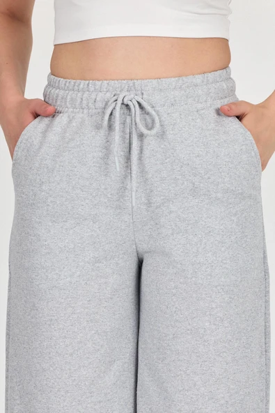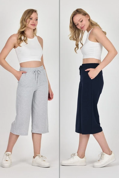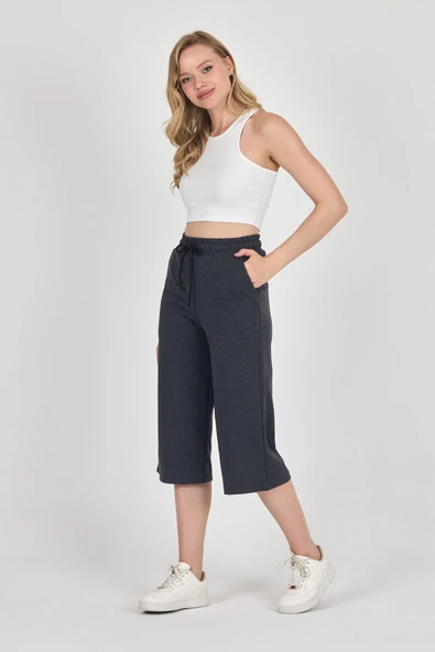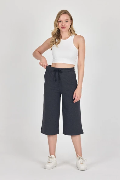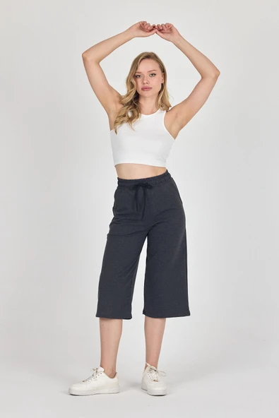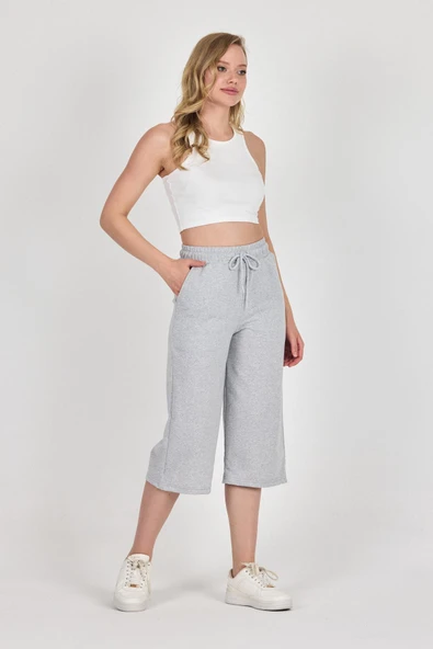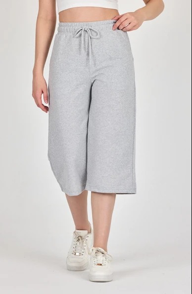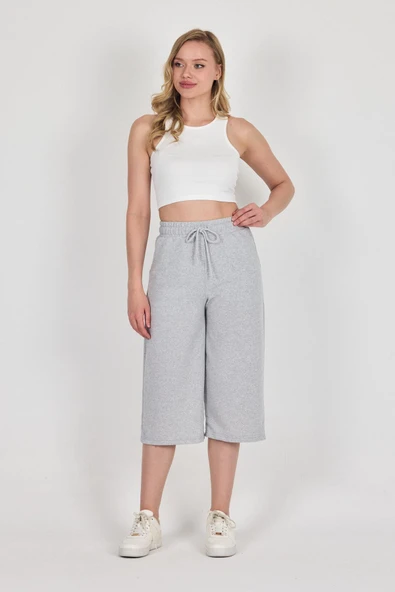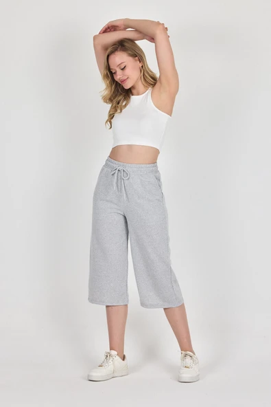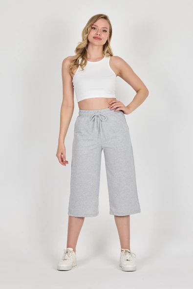Yüksek Bel Cepli Rahat Kesim Mevsimlik Kadın Diz Altı Bermuda Gri Kapri Şort