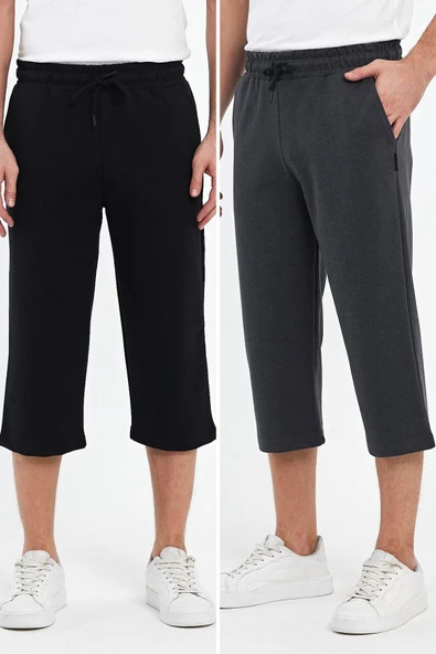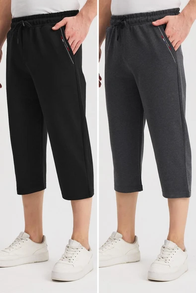 Erkek 2'Li Cepleri Fermuarlı Siyah-Antrasit Bermuda Diz Altı Kapri Beli Ayarlanabilir Lastikli Uzun MTLCE94