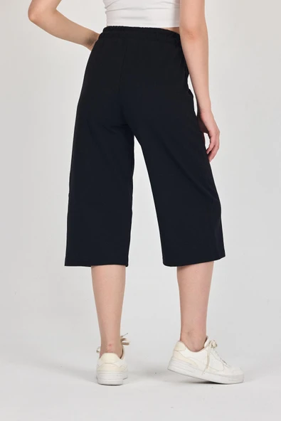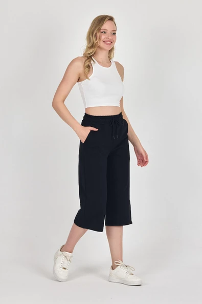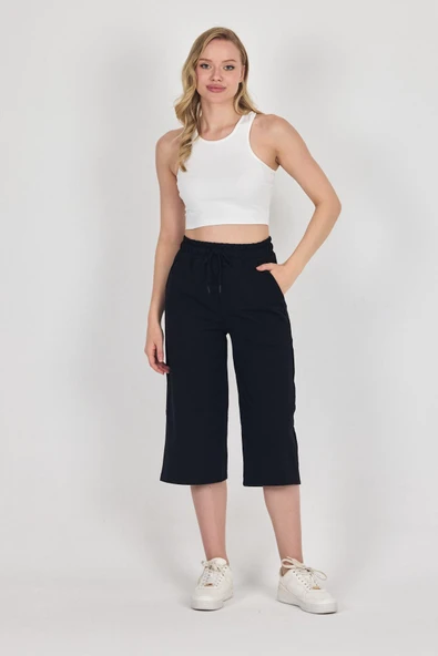 Yüksek Bel Cepli Rahat Kesim Mevsimlik Kadın Diz Altı Bermuda Siyah Kapri Şort