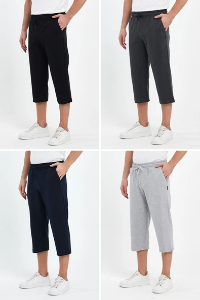 Erkek 4'Lü Yanları Cepli Bermuda Diz Altı Kapri Beli Ayarlanabilir Lastikli Uzun Şort