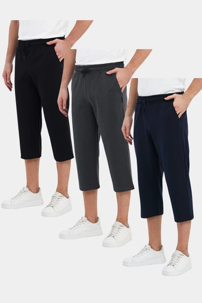 Erkek Yanları Cepli Siyah-Lacivert-Antrasit Bermuda Diz Altı Kapri Beli Ayarlanabilir Lastikli 3'lü Uzun Şort